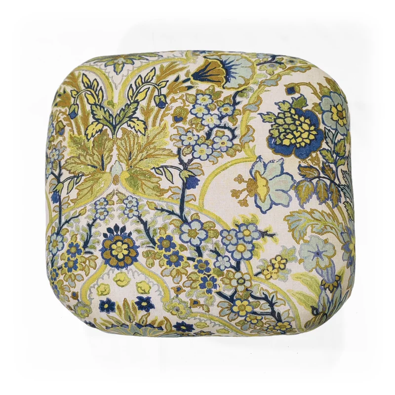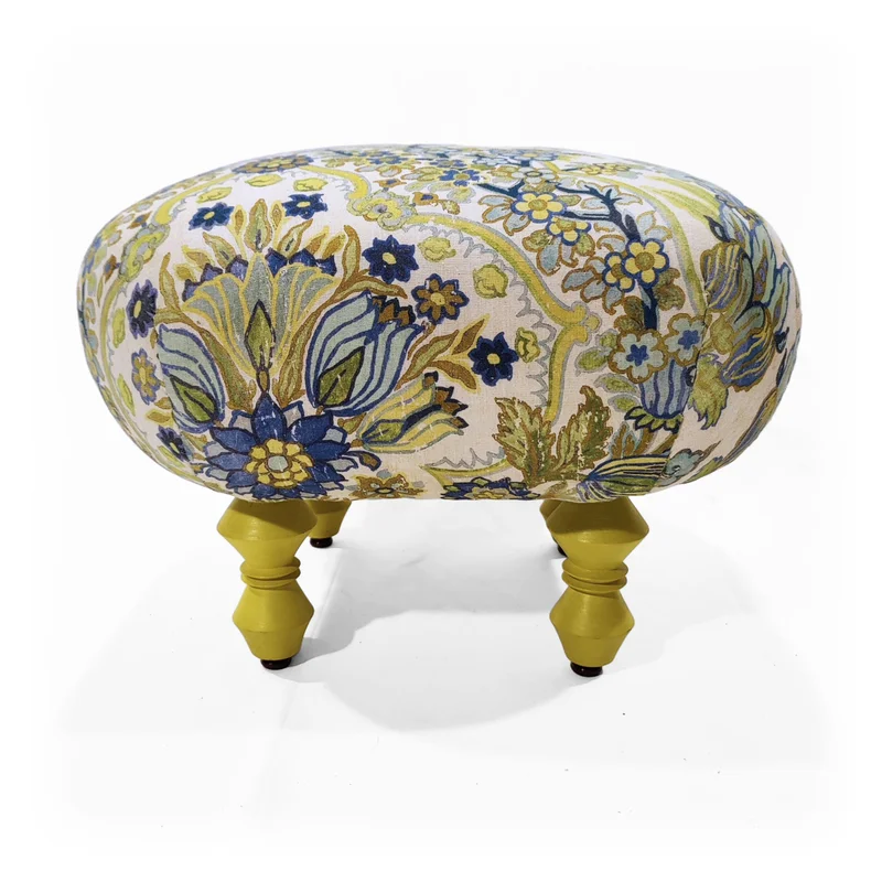 This romantic footstool blends classic and modern vibes. The floral linen adds a delicate, chic touch. Rounded corners soften its elegant silhouette. Handcrafted elements ensure a unique piece. Ideal for buyers wanting luxurious accents.