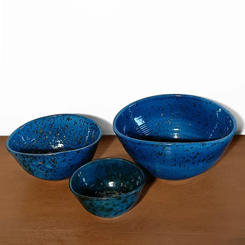 Set of three handcrafted Moroccan ceramic bowls with blue speckled glazes.