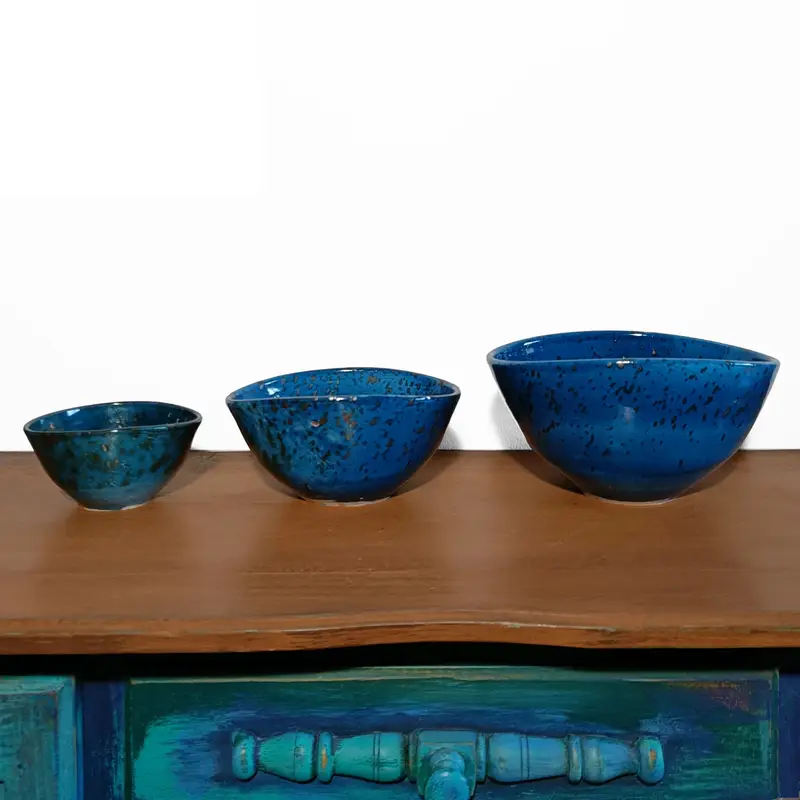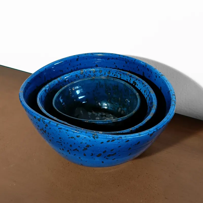 The Moroccan blue ceramic bowls set bring expressive texture, bold color, and artisanal craftsmanship to any interior. Their versatile sizes elevate contemporary decorative compositions.