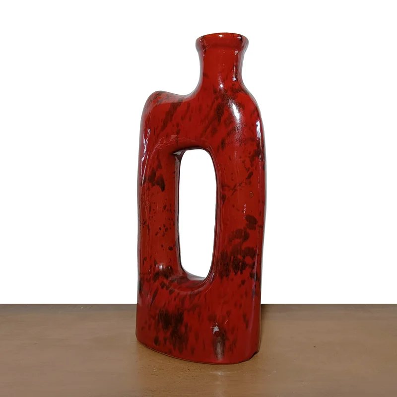 The organic silhouette draws inspiration from natural forms, resulting in a shape that feels fluid yet structured. The deep red glaze contrasts with the dynamic black stains, creating a visual rhythm that enhances the vase’s modern personality. This design effortlessly complements both minimalist and eclectic interiors.