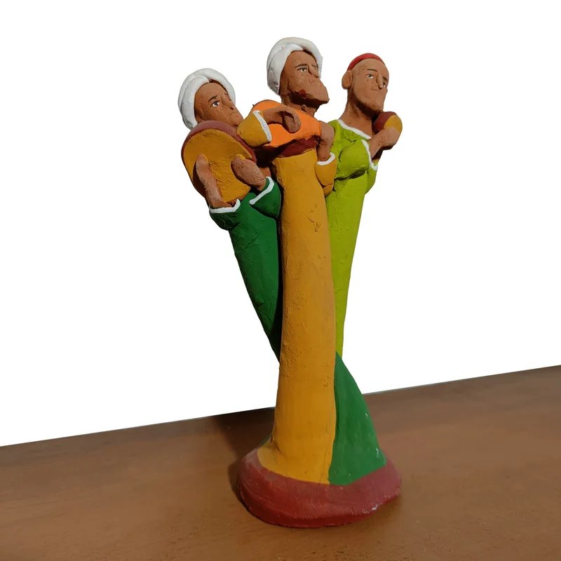 Handmade brown clay statuette by Moroccan artist Kdadri, part of the Morettina®’s  KASBAH VISION Collection. Three musicians in traditional attire, ideal for cultural and artistic décor.