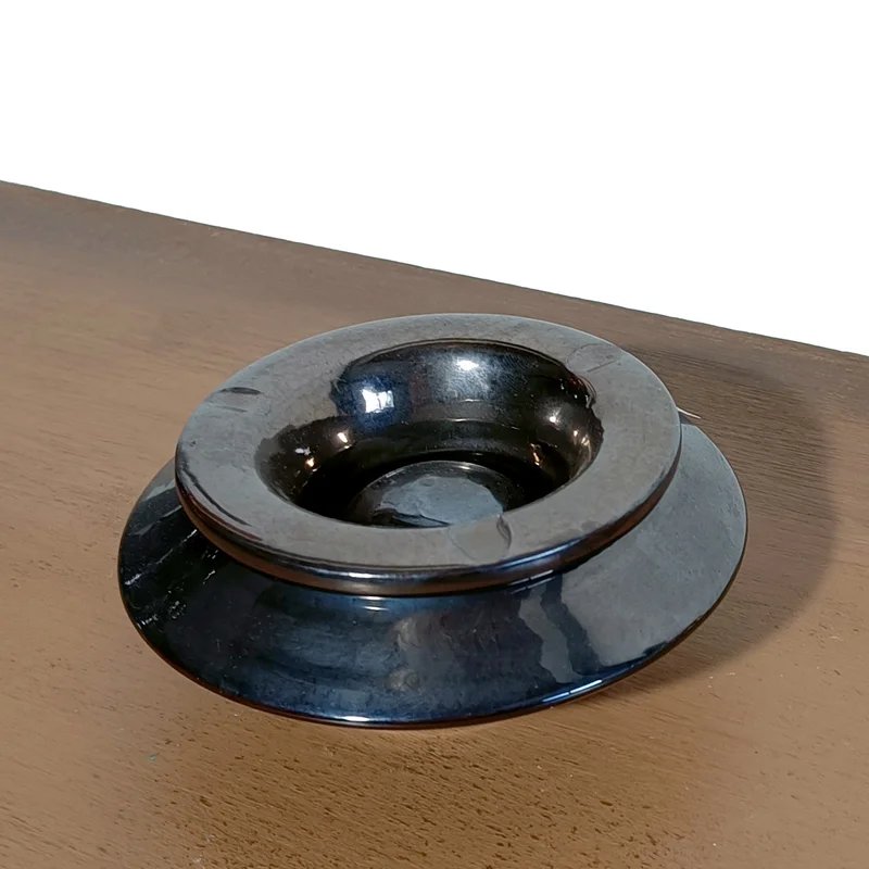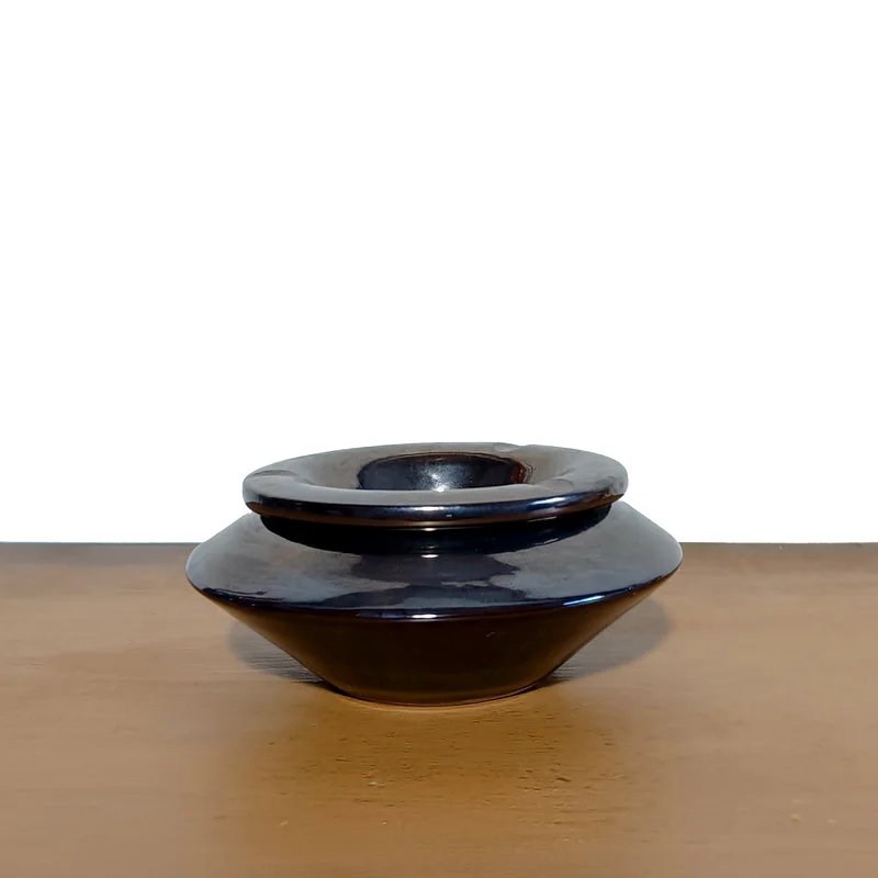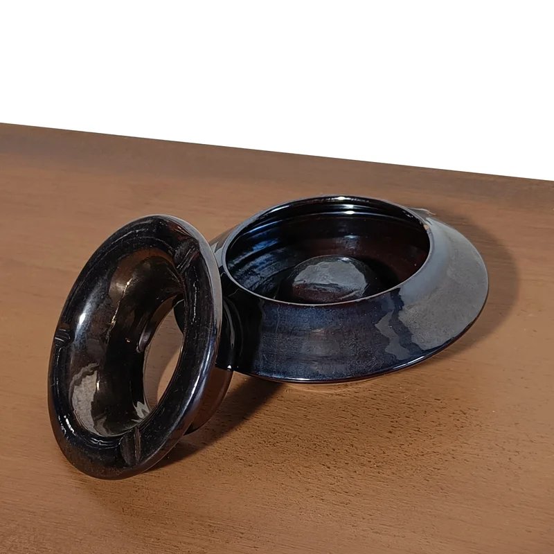 The ashtray is made of ceramic with a high-gloss titanium-tone glaze. The surface is easy to clean and maintains a polished appearance. The glaze enhances its smooth curves and gives depth to the dark reflective color.