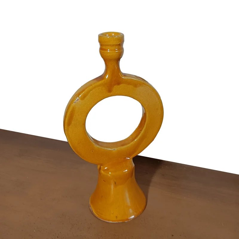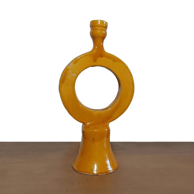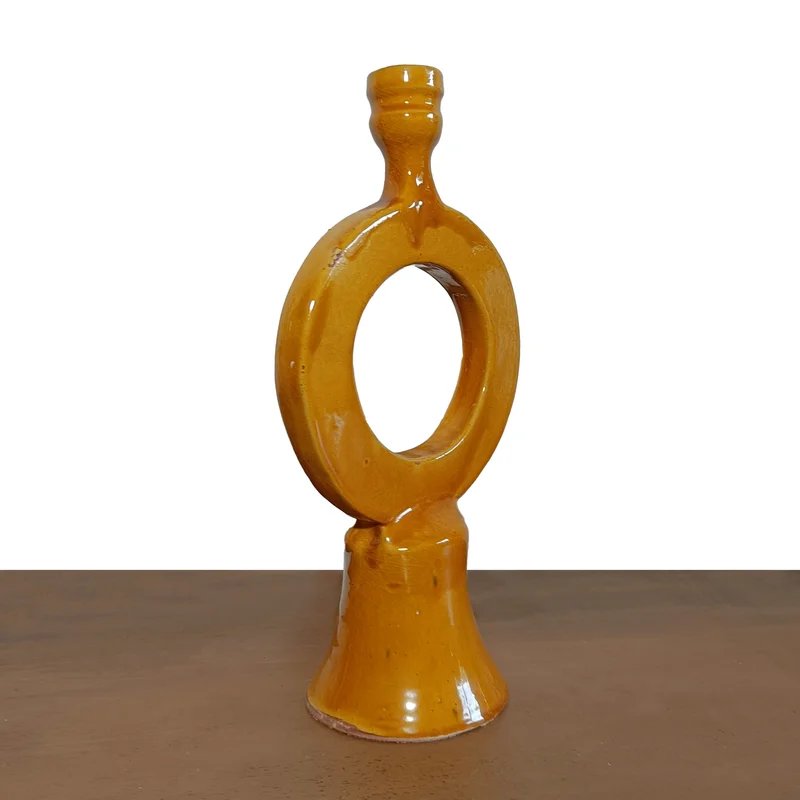 Sculptural ceramic candlestick from Morettina®’s  KASBAH VISION Collection, featuring a circular open shape and warm mustard glaze. A unique Moroccan artistic pottery piece for refined interiors.