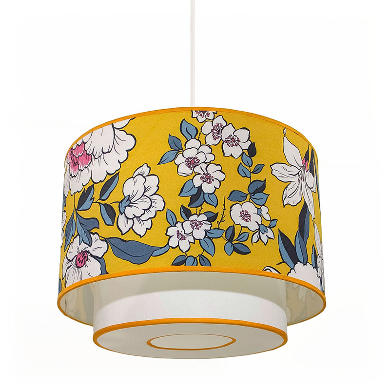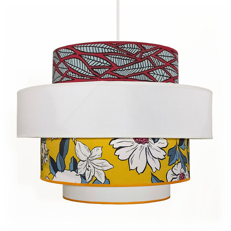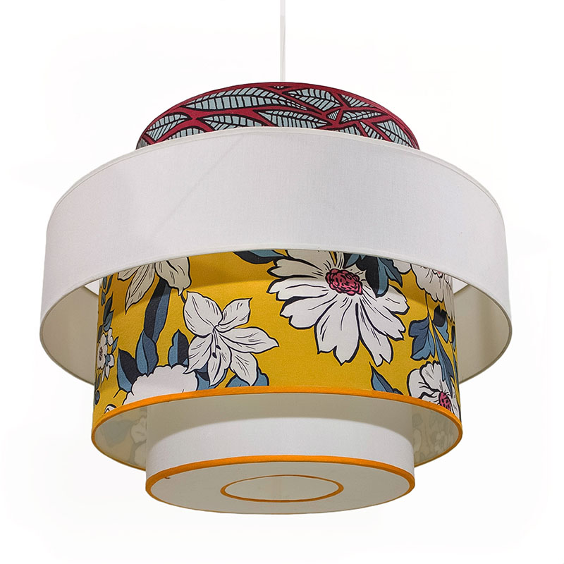 The lampshades are made of transparent polyphane, covered with carefully selected premium fabrics. The main fabric features large white flowers with purple accents and ash-blue leaves on a mustard yellow background, paired with a bold leaf-patterned fabric in magenta and ash blue. This vibrant yet balanced combination creates a harmonious play of colors and textures, making this light fixture a true eye-catching décor element.