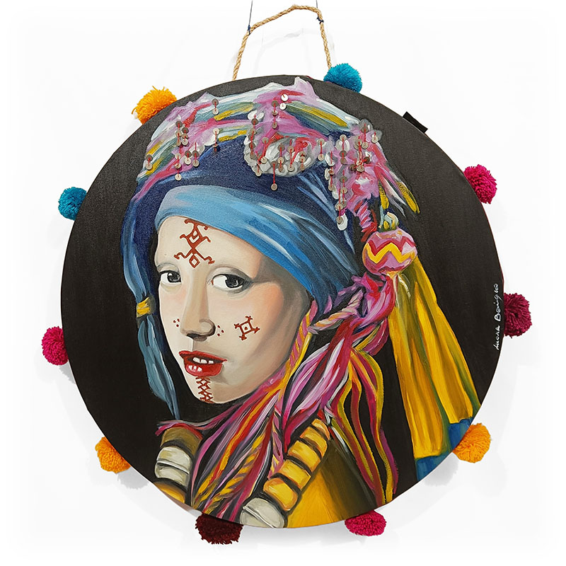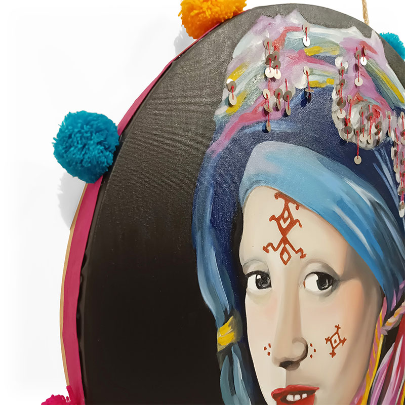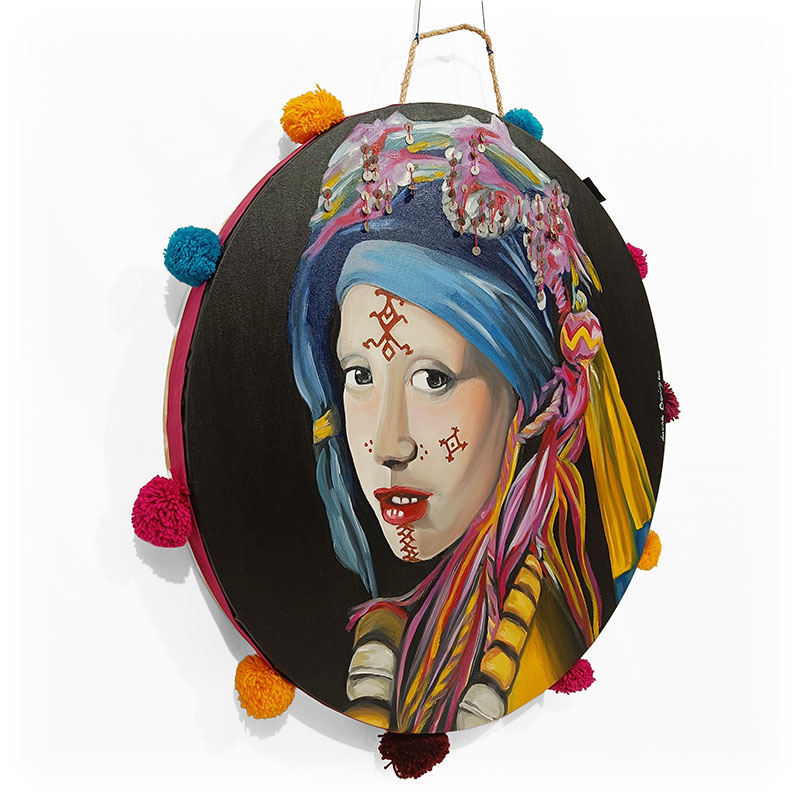 MOROCCOCO Collection -Berber Woman Vermeer  Painting, an exclusive oil painting by Mara Benigno, inspired by Vermeer’s “Girl with a Pearl Earring” and transformed with traditional Berber culture. Painted on a circular canvas resembling a bendir (Berber drum), this piece features intricate jewelry, tattoos, and shimmering sequins for a striking, three-dimensional effect. A must-have for art lovers!