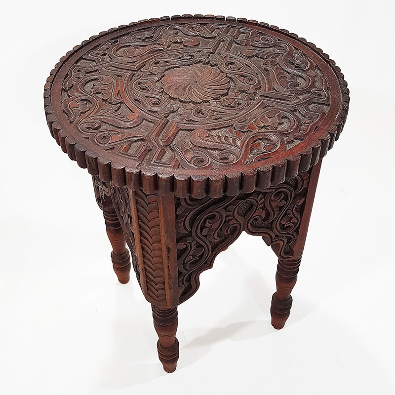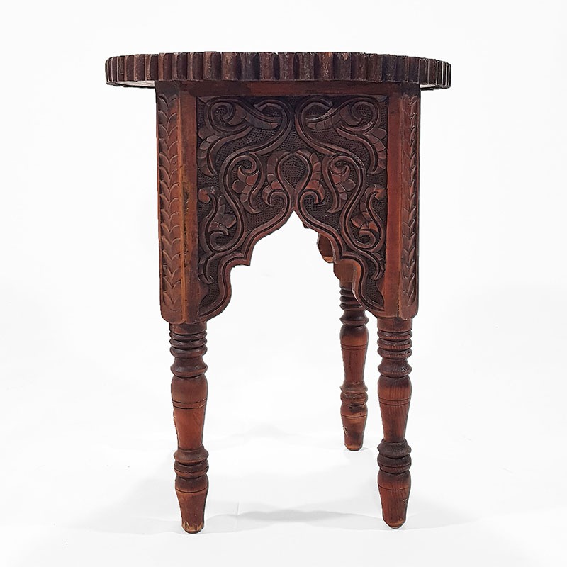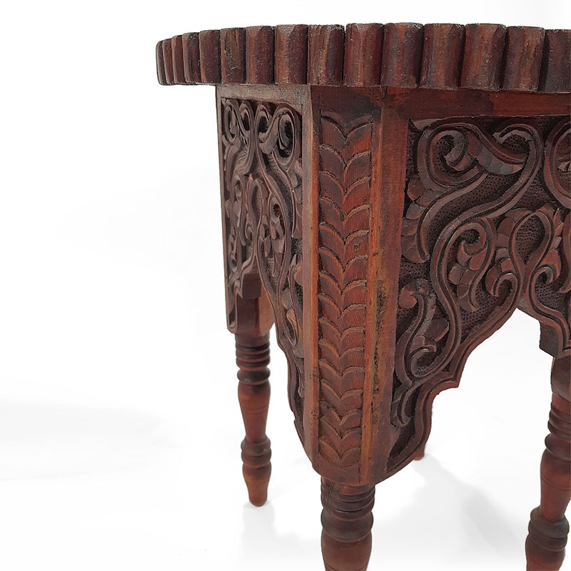 The design fits seamlessly with various interior styles. It complements bohemian compositions, traditional Moroccan lounges, minimal environments, or contemporary homes searching for a unique accent. The rich tones and carved textures work beautifully with textiles, cushions, and natural materials. It also functions as a display table, plant stand, or decorative corner piece.