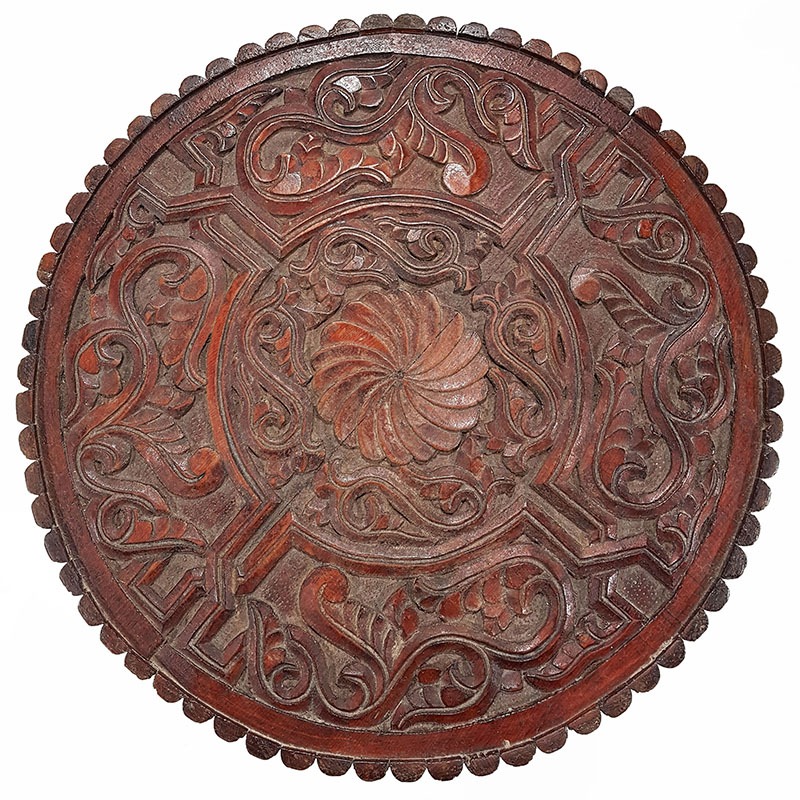 Traditional round Moroccan side table with hand-carved wood, restored in the MORETTINA® workshop and finished with Italian wax for an aged patina. Part of the  MOROCCOCO Collection.